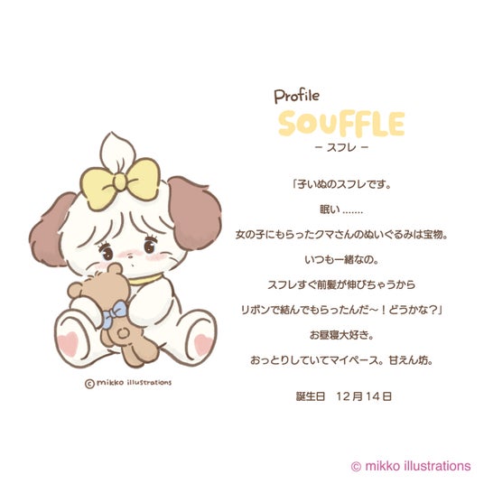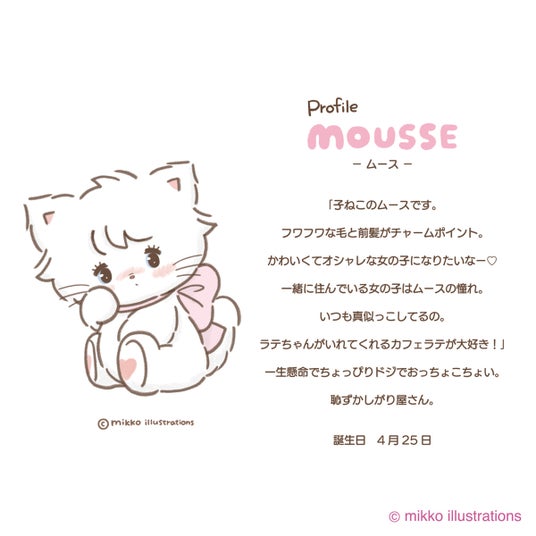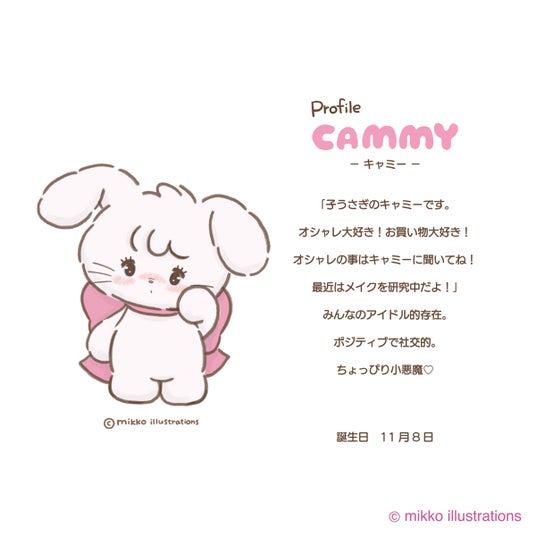 オリジナルキャラクター“mikko characters”のムース、キャミー、ラテ、スフレや女の子のイラストを通してキュン! とときめいたり、ハッピーをお届けしたいです。