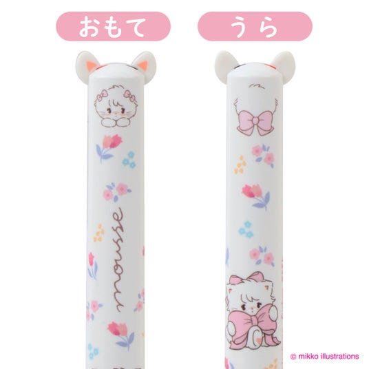 mimi(R)ペンとは、ペンの左右にあるパーツをノックすることで赤と黒の2色のインクを使い分けることが出来るユニークなボールペン。ムース、ラテ、キャミ―、スフレ、それぞれのキャラクターの耳の部分がノックできるようになっています。また、軸の部分にもキャラクターの様々な表情とお花のデザインが入っており、後ろ姿までかわいい!のがポイントです。