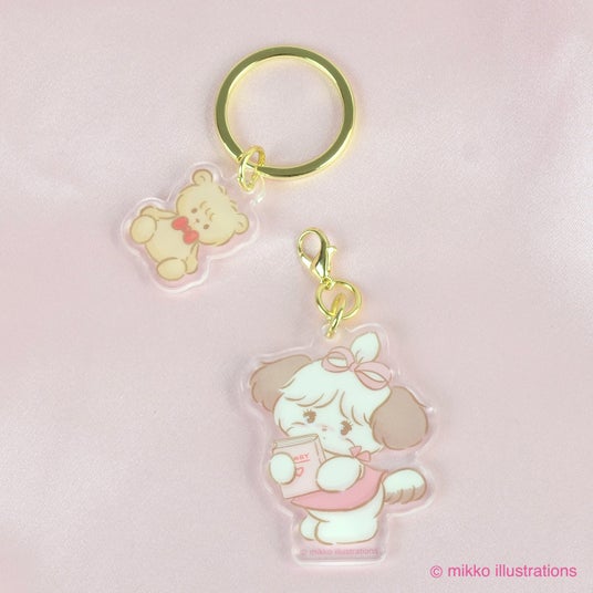 キャラクターとモチーフの2パーツ仕様で、チャームがゆらゆら揺れるキュートなデザイン。キャラクターパーツは留め具で外せるようになっており、ファスナーチャームなどとしても使うことが出来る便利な仕様です。お気に入りのバッグや鍵に取り付けていつも一緒に。