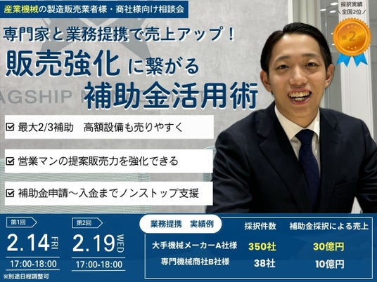 認定支援機関 株式会社フラッグシップ経営は2025年2月14日(金)19日(水)に産業機械やシステムのメーカー様、商社様を対象とした「販売強化に繋がる補助金活用術」に関するWEBセミナーを開催します。