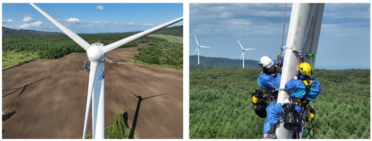 ユーラス田代平ウインドファーム(秋田県鹿角市)での風力発電機のブレード補修の様子。「Eurus O&M Service」のサービス内容に含まれます。