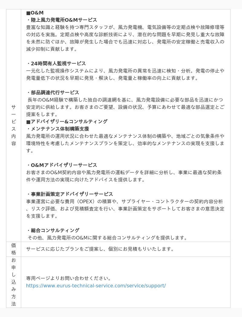 当社は今後も「クリーンエネルギーの普及・拡大を通じ、地球環境保全の一翼を担う」という企業理念のもと、本サービスの受託拡大を通じて風力発電業界の発展に貢献してまいります。