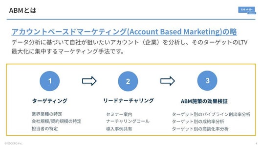 BtoB SaaSの販売支援・インサイドセールス支援事業を展開するRECERO株式会社は、企業のインサイドセールス責任者・担当者向けに、「売上に繋がるABM施策成功事例集」をお役立ち資料公開しました。