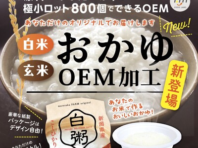 HACCP認定・有機JAS加工認証工場でパックごはん製造を行う、株式会社TMフードラボ(京都府木津川市)から「パックおかゆ加工」が新ラインナップで登場。あなたのお米を原料にして、極小ロット(800個)のオリジナルパックおかゆに仕上げます。しかもパッケージデザインまで自由自在のオリジナルで作成!中身はあなたのお米で。パッケージもあなたのお好みのデザインで。世界にひとつだけのパックおかゆができあがります!