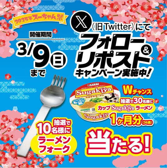 スガキヤ公式Xにて、ラーメンフォークやカップSugakiyaラーメン1ヶ月分(36食)が抽選で当たるフォロー&リポストキャンペーンも開催いたします。