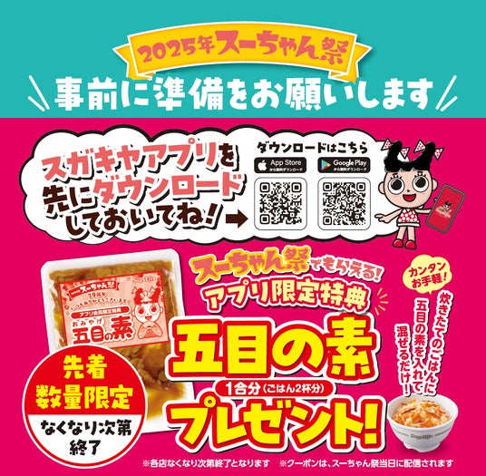 「スーちゃん祭2025」では3種のセットを通常価格の半額とさせていただき、定番のラーメンとソフトクリームのセットが310円などお得な価格でご提供させていただきます。さらに、アプリダウンロードでスガキヤのおみやげ「五目の素(一合分)」も先着順でプレゼントいたします。