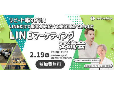 株式会社サブスクライン(本社:東京都渋谷区、代表取締役:石川勝己)は、2025年2月19日(水) 20時に、渋谷駅直結の渋谷スクランブルスクエア15F(SHIBUYA QWS内)にてリピート率90%!LINEだけで集客が完結する美容室ができるまで@LINEマーケティング交流会と題し、参加無料の勉強会&交流会を開催します。