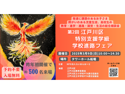 365日体験型子ども食堂を運営するNPO法人らいおんはーと(事務局:東京都江戸川区、理事長:及川 信之)は「第2回江戸川区特別支援学級・学校進路フェア」を2025年3月9日(日)タワーホール船堀にて開催いたします。特別支援学級・学校の生徒が義務教育を終了した後の進路には多くの可能性がありますが、当事者や保護者に情報が届きにくい状況です。