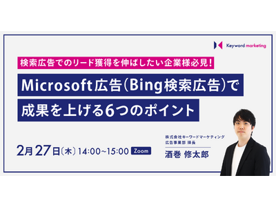 株式会社ベクトル(本社:東京都港区、代表取締役会長兼社長:西江 肇司、東証プライム:6058)の子会社である株式会社キーワードマーケティング(本社:東京都港区、代表取締役会長:滝井 秀典)は、無料オンラインセミナー『検索広告でのリード獲得を伸ばしたい企業様必見!Microsoft広告(Bing検索広告)で成果を上げる6つのポイント』を2月27日(木)14時より開催いたします。