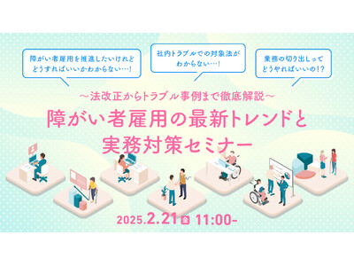 「働く」に関する社会課題をビジネスで解決するキャムコムグループの株式会社天職市場(本社:東京都新宿区、代表取締役:春名敬太 、以下:天職市場)は、2025年2月21日(金) 11:00よりオンラインセミナー『障がい者雇用の最新トレンドと実務対策セミナー~法改正からトラブル事例まで徹底解説~』を開催いたします。