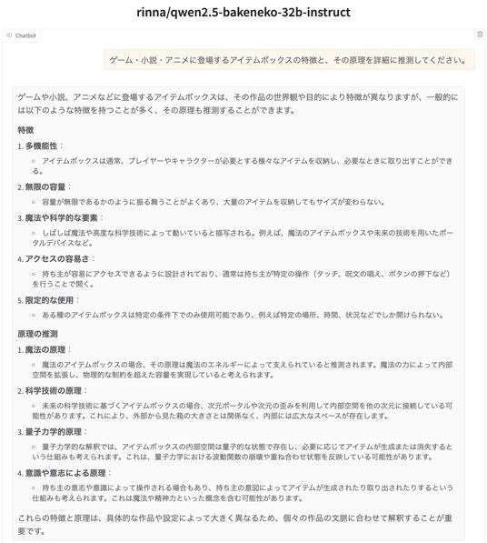 図1:Qwen2.5 Bakeneko 32B Instructのテキスト生成例