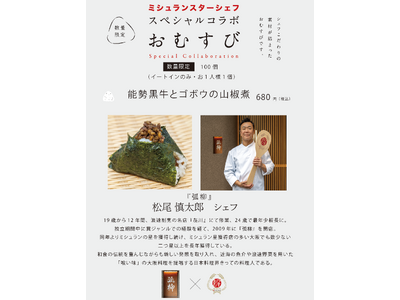 空堀商店街"(谷町六丁目駅~松屋町駅)の人気おむすび屋さん『おびむす』にて、関西を代表するミシュランスターシェフが調理した具材を使用するミシュランおむすびの第七弾が2月14日より提供開始となります!スターシェフ"監修"ではなく、シェフが"実際に"調理した具材を具としておにぎりを握る!そんな夢のコラボが実現。今回のコラボは開店以来ミシュランの星を獲得し続け、現在は2つ星を誇る大阪屈指の名店『弧柳』松尾慎太郎シェフ。大阪産 幻の能勢黒牛を使用した松尾シェフ至高の一品をぜひご賞味ください!