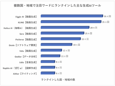 (※)各キーワード(生成AIツール名)が、Google トレンドトップ10にいくつの国・地域でランクインしたのかを示しています。