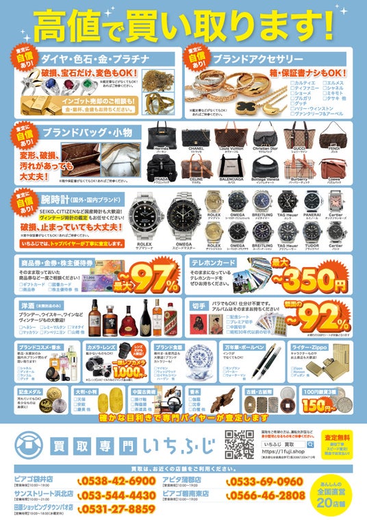 「買取専門 いちふじ」ピアゴ新城店では、オープンを記念して、期間限定でブランド品や貴金属などの買取額を通常より20%アップするキャンペーンを実施いたします。また豪華賞品の当たる抽選会イベントも実施いたします。この機会にぜひお手元のブランド品をお持ち込みいただき、高価買取をご体験ください。