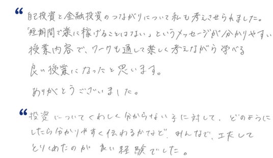 投資や金融の知識を備えた次世代人材を育成し、未来を見据えて「価値を理解し、かつ自ら価値を創造することを意識して行動できる次世代の人材」を育てていくことが、長期的に見て企業だけでなく社会全体の価値の増大につながっていくものであると考えています。