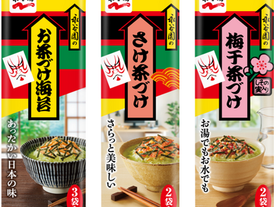 株式会社 永谷園(社長:掛谷 浩志、東京都港区)は、お馴染みのお茶づけレギュラーシリーズ小容量タイプの味わいはそのままに、内容量を変更し、手に取りやすい価格とデザインになった「お茶づけ海苔 3袋入」「さけ茶づけ 2袋入」「梅干茶づけ 2袋入」(税抜130円)を2025年3月3日(月)より全国でリニューアル発売いたします。パッケージには食シーンを想起しやすいシズル写真を採用することで、「お茶づけ」の美味しさや簡便さを、初めてお使いのお客様にも分かりやすくご提案いたします。