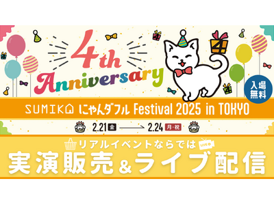 株式会社TIRAMISU(本社:東京都世田谷区 代表取締役:高澤 匡 以下「当社」)が運営する 猫ぐらしブランド「キミとワタシのSUMIKA」は2025年2月21日から2月24日の4日間に渡り「東京都中小企業会館」1Fイベントスペース(東京都中央区銀座2-10-18)にて、ブランド生誕4周年記念イベント、SUMIKA 4th Anniversary『にゃんダフルFestival 2025 in TOKYO』を開催いたします。