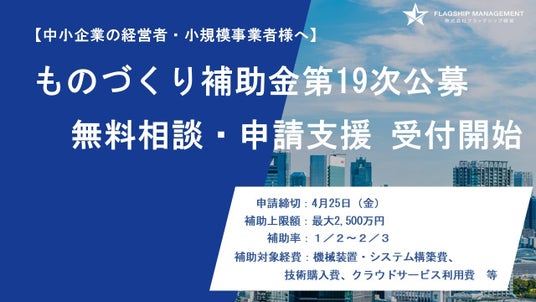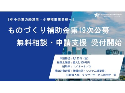 株式会社フラッグシップ経営は、2025年2月17日(月)より、「ものづくり・商業・サービス生産性向上促進補助金 第19次公募」に関する無料相談の受付を開始いたしました。