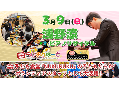 365日体験型子ども食堂『NUKUNUKU』の子ども達は、3月9日(日)にタワーホール船堀で開催される医師かつピアニストの浅野涼先生のコンサートに、ボランティアスタッフとして参加いたします。