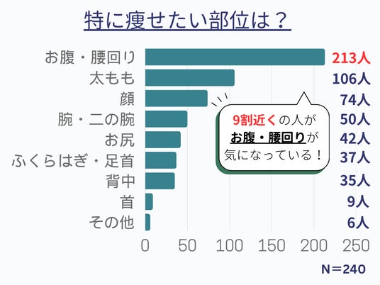 特に痩せたいと思っている部位は圧倒的に「お腹・腰回り」が多い結果に