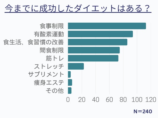 そして、実際に行ってみて成功したと感じたダイエットも同じく、食事制限や有酸素運動という結果になりました。食事制限で摂取カロリーや糖質を減らしたり、運動で脂肪を燃焼したりといったシンプルな行動でダイエット効果が実感できる人も多いようです。