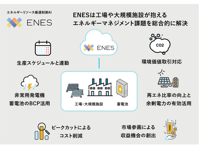 需要家側のリソース制御に関する豊富な経験を活かして、蓄電池や太陽光発電といったエネルギーリソースをAIで最適制御する「ENES」を提供し、需給調整市場や容量市場への参加を容易にしてまいりました。今回、工場特有の生産計画や運用上の制約をさらに踏まえ、再エネ比率の向上や環境価値の活用を強化した「工場向けENES」を提供開始致しました。