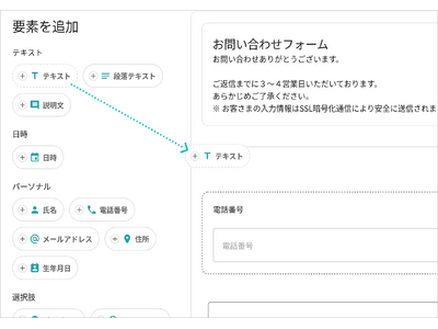 直感的なフォームの作成と編集必要な要素を選択してドラッグ&ドロップで完成するため、直感的な操作でフォームが作れます。テンプレート(お問い合わせフォーム、クイックアンケート、申込フォーム、ご予約受付フォーム)を利用すれば、短時間でプロフェッショナルなフォームが完成します。