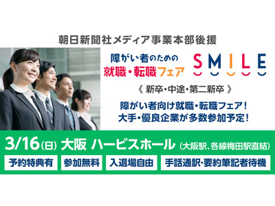 関西や全国で障がい者採用に積極的な大手・優良企業が多数集結! ≪朝日新聞社メディア事業本部後援≫ ※入場無料・入退場自由/会場:ハービスホール(大阪駅・梅田駅直結)