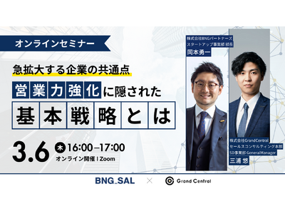 BNGパートナーズと株式会社Grand Centralは、「【急拡大する企業の共通点】"営業力強化"に隠された基本戦略」をテーマにした共催セミナーを2025年3月6日に開催します。