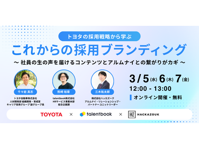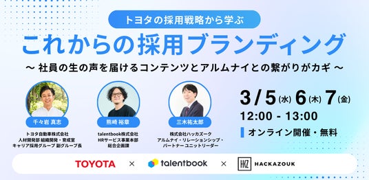 就活・転職活動に役立つキャリア学習サイト「talentbook」及び、法人向け採用マーケティング支援サービスを提供するtalentbook株式会社(本社:東京都渋谷区、共同代表取締役:大堀航・大堀海 以下、当社)は、3/5(水)12時より、無料オンラインセミナー『トヨタの採用戦略から学ぶ、これからの採用ブランディング ~社員の生の声を届けるコンテンツとアルムナイとの繋がりがカギ~』を株式会社ハッカズーク(本社:東京都文京区、代表取締役グループCEO:鈴木仁志)との共催にて実施いたします。