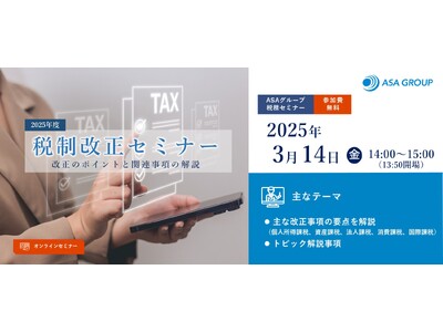 国内5拠点とシンガポールを拠点に、金融・会計・税務・コンサルティングサービスを提供するASAグループ(本社:東京都港区、グループ代表:松澤 和浩、粟国 正樹)は、2025年3月14日(金)14:00~15:00に、「2025年度税制改正セミナー」と題するオンラインセミナーを開催いたしますので、お知らせいたします。