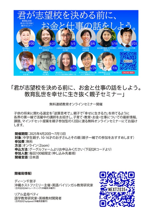 合同会社TopSpeed(沖縄県那覇市)と合同会社DMトレーディング(沖縄県沖縄市)は、12回にわたる無料連続教育オンラインセミナー「君が志望校を決める前に、お金と仕事の話をしよう。教育乱世を幸せに生き抜く親子セミナー」を2025年4月20日~7月13日に開催します。職業・社会の変化が激しく、教育選択肢が多様化している昨今はまさに教育乱世と言えます。将来の子どもさんの職業選択や進学先の選定を「逆算思考で」できるように、もっと親子が「幸せに生きる力」を身に着けられるように、各界の第一線で活躍されている講師をお招きし、子育て・教育・お金・仕事についての刺激的な最新情報、問題意識、マインドセット提案をお届けします。