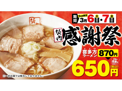 3月6日(木)、7日(金)の2日間は、看板商品「喜多方ラーメン」を通常価格から220円引きの650円(税 込)でご提供いたします。さらに、より多くのお客様に喜んでいただけるよう、人気メニューの「味玉 ラーメン」と「喜多方わんたんラーメン」も、それぞれ通常価格から220円引きでお召し上がりいただ けます!どちらも多くのお客様に愛されているメニューで、すっきりコク旨なスープとこだわりトッピ ングの相性は抜群。ぜひこの機会に、ご家族やご友人と一緒に贅沢な味わいをお楽しみください。本イ ベントは、長年ご愛顧いただいているお客様への感謝の気持ちを込めて実施いたします。ご来店いただ いたすべてのお客様に、お得な価格で最高のラーメンをお届けできることを楽しみにしております。ぜ ひ、この機会に「喜多方ラーメン坂内」で至福の一杯をご堪能ください。