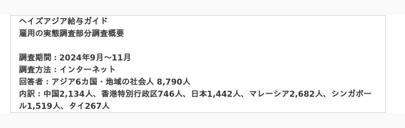 外資系人材紹介会社ヘイズ・スペシャリスト・リクルートメント・ジャパン株式会社(本社:港区、マネージング・ディレクター:グラント・トレンズ、以下ヘイズ)は本日、アジア6ヶ国・地域(中国、香港特別行政区、日本、シンガポール、マレーシア、タイ)における1260職種の給与(当社実績ベース)と、約9,000人の社会人に対して実施した雇用の実態調査の結果をまとめた「2025ヘイズアジア給与ガイド」を発表します。