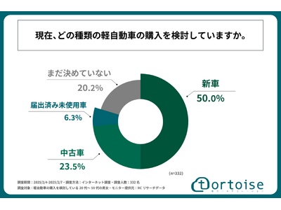 株式会社トータス(本社:神奈川県大和市、代表取締役:村野 公紀)が展開する「tortoise」は、軽自動車の購入を検討している20代~50代の男女を対象に「軽自動車購入検討者の新車・中古車・届出済み未使用車に対する意識と選択基準に関する調査」を実施しました。