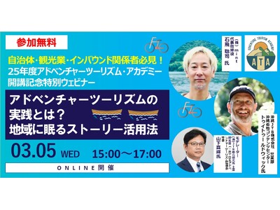 一般社団法人日本アドベンチャーツーリズム協議会(本社:東京都品川区、代表取締役:大西 雅之)は、株式会社JTB総合研究所と共催で、2025年度アドベンチャーツーリズム・アカデミーの開講記念ウェビナーを3月5日に開催します。広島の自転車ツアーと沖縄の伝統文化体験の事例を学びながら、地域資源を活かした観光コンテンツの作り方を実践的に学べる貴重な機会です。※株式会社JTB総合研究所が事務局運営を受託しています。