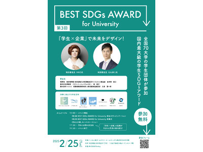THAT'S FASHION WEEKEND実行委員会(所在地:長野県軽井沢町、代表:菅野充)は2025年2月25日(火)『第3回 BEST SDGs AWARD for University』をトンネル東京(セガサミーホールディングス株式会社本社)にて開催する。本アワードは『学生×企業』で未来をデザイン!をテーマに、全国のSDGsに関わる活動を行う大学生にスポットライトが当たる場を創出することを目的に設立された。