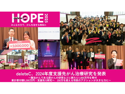 認定NPO法人deleteC(デリート・シー 代表理事:小国士朗)は、2024年度の支援先となるがん治療研究が決定したことをご報告します。2019年の設立以降、deleteCでは小児がんや子宮頸がん、肺がんのほか、臨床研究に関わる看護師やリモート治験、ドラッグロス・ラグなどのテーマに対し寄付・啓発を行ってまいりました。