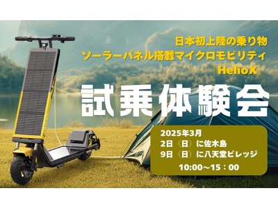 株式会社HelioX(本社:東京都豊島区、代表取締役:ハンビン)は、広島県三原市との連携のもと、日本初上陸となるソーラーパネル搭載マイクロモビリティ「HelioX」の試乗会を、2025年3月2日(日)に佐木島、3月9日(日)に八天堂ビレッジにて開催いたします。
