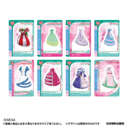 ラインナップは全21種。キャラクターデザイン4種と、ドレスアップカードデザイン14種とステージデザイン2種とシークレットが1種あり、集めて重ねて楽しいシリーズです。