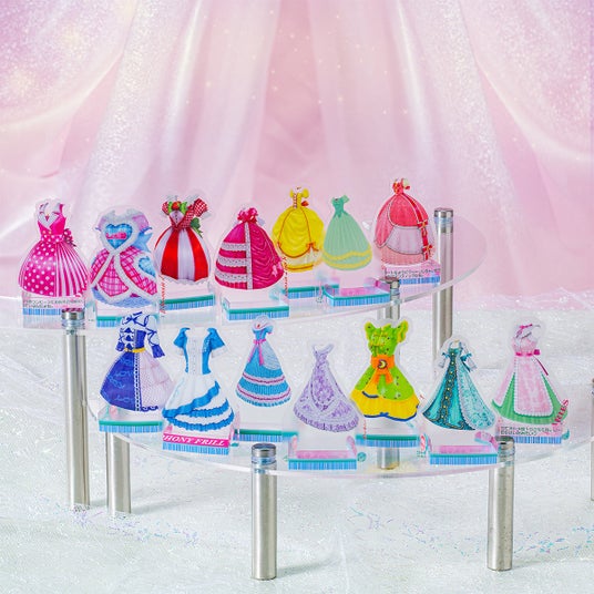 キャラクターデザイン・ドレスアップカードデザインのシートをそれぞれスタンドにして飾るのはもちろん、今回は重ねて着せ替えできるギミック・背景として後ろの差し込み口にもさして奥行きを楽しめるギミックを追加しております。※日本特許出願済み