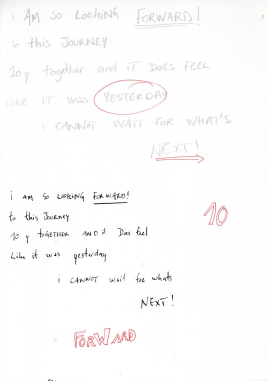 【文章和訳】この旅がとても楽しみだ。10年を共にしているけれど、まるで昨日のことかのように思える。これから先が待ち遠しい。