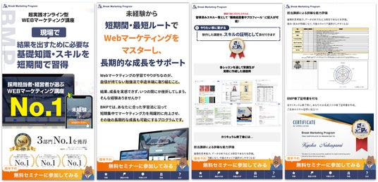 未経験・初心者の方がゼロからWebマーケティングを習得し、転職や副業など新たなキャリアを歩み出す支援を行うオンラインスクールです。全18週間・200時間の超実戦型カリキュラムにより、最短期間で未経験からWebマーケターとして現場で活躍するために必要な「スキル・知識・マインド」を習得できます。