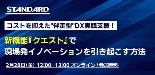 「コストを抑えた“伴走型”DX実践支援!新機能『クエスト』で現場発イノベーションを引き起こす方法」と題した無料ウェビナーを開催いたします。