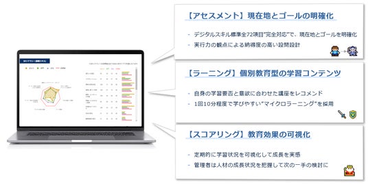 アセスメント結果に基づいて個人毎に必要講座をレコメンドする"業界初のDX個別教育プラットフォーム"です。