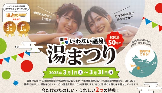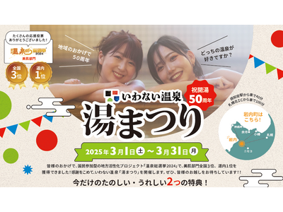 これらの成果は、開湯50周年を迎えるにあたり、地域住民の皆様をはじめ、いわない温泉ファンの皆様、関係者の皆様の長年にわたるご支援とご尽力の賜物です。そこで、50周年と「温泉総選挙2024」での受賞を記念し、日頃の感謝の気持ちを込めて「いわない温泉 湯まつり」を2025年3月1日(土)~3月31日(月)で開催します。