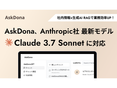 株式会社GFLOPS(本社:東京都渋谷区、代表取締役CEO:盛本マリア、共同代表:鈴木亮祐)は、法人向けRAG活用プラットフォーム「AskDona」のGPTチャット機能において、Anthropic社の最新モデル「Claude 3.7 Sonnet」に対応したことをお知らせいたします。
