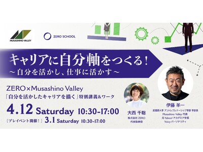 次のステップに踏み出すすべての人を応援するスタートアップスタジオ「Musashino Valley」を運営する株式会社MVP(所在地:東京都三鷹市、代表取締役MF 伊藤 羊一、以下:MVP)は、会員の大西千聡氏(株式会社ZERO 代表取締役)が主催するイベント「キャリアに自分軸をつくる!ー自分を活かし、仕事に活かすー」が3月1日、4月12日の2日間、Musashino Valleyにて開催されることをお知らせします。