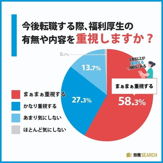 実際、最近の調査によると、転職時に福利厚生を「まぁまぁ重視する」58.3%、「かなり重視する」27.3%の合計で、約8割以上の人が福利厚生を重視していると回答しています。