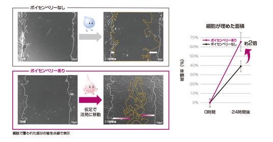 培養した細胞の一部を剥がし、その空隙に細胞が移動して、隙間が埋まっていく様子を撮影した写真です。ボイセンベリーを添加すると、細胞の動きが活発になっていることが分かります。(図6)